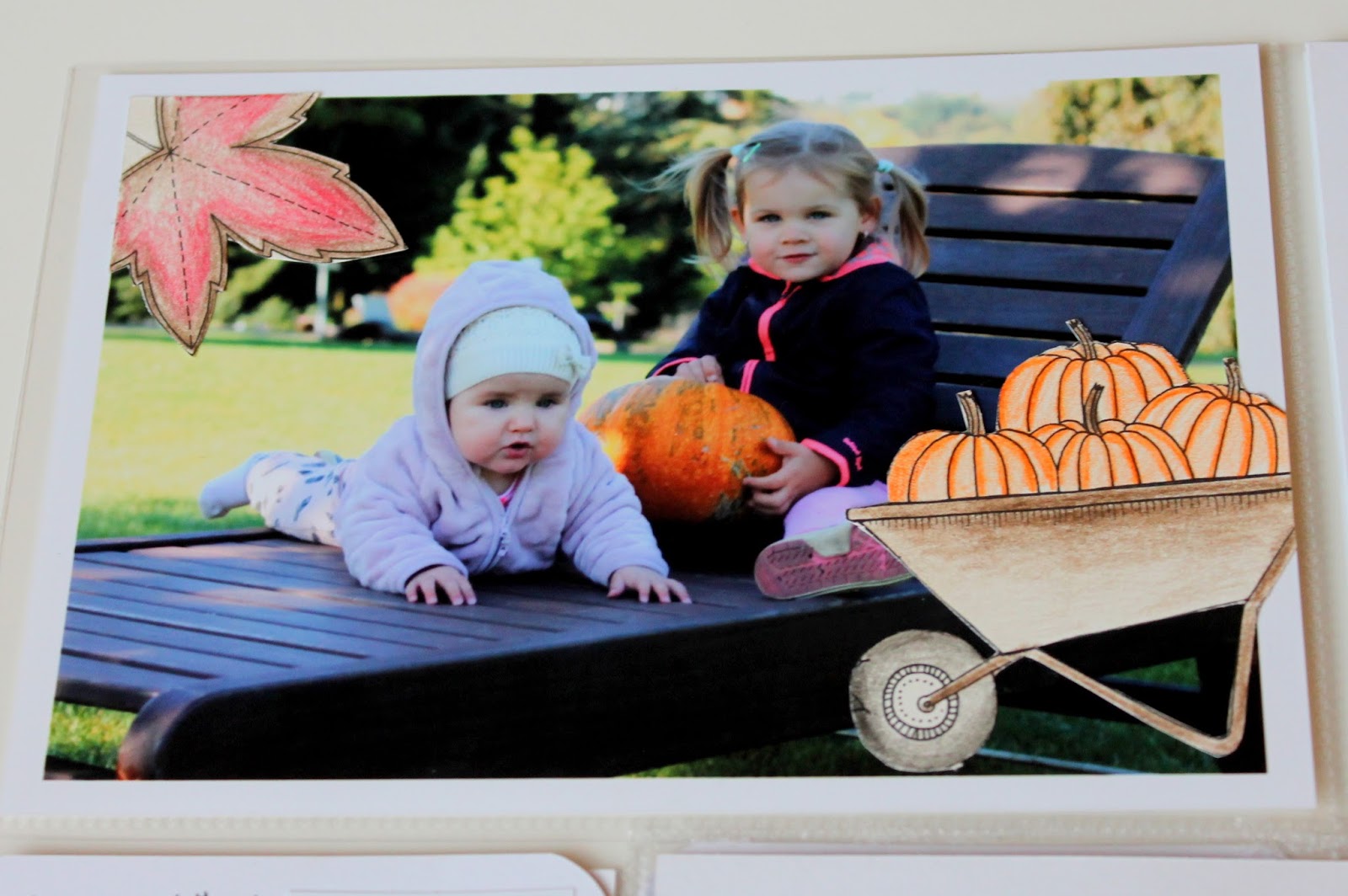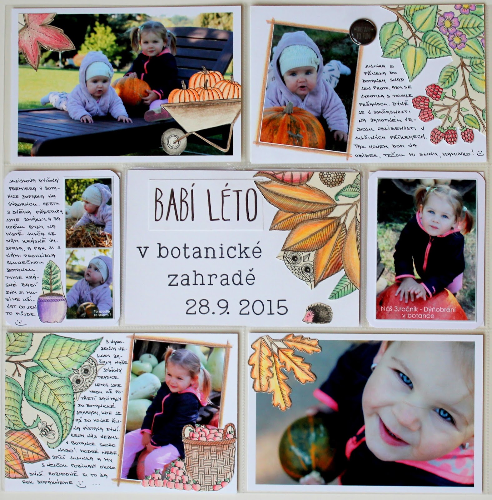 Nejprve jsem byla přesvědčená o tom, že vystřihám pár lístečků, které vybarvím a občas nějaký pohodím na kartičku. A jak vidíte, došlo to dokonce až k dýním :-D. Ale na druhou stranu kdy jindy mít album tak trošku infantilní než teď. Za třicet let to asi pojmu jinak :-D.