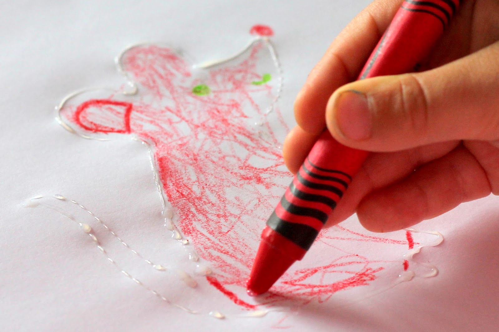 - na tmavá papír jsme lepidlem namalovaly pár základních obrázků – Nela chtěla vodu a srdíčko, přidaly jsme pak i nějaký ten křížek a klikyhák