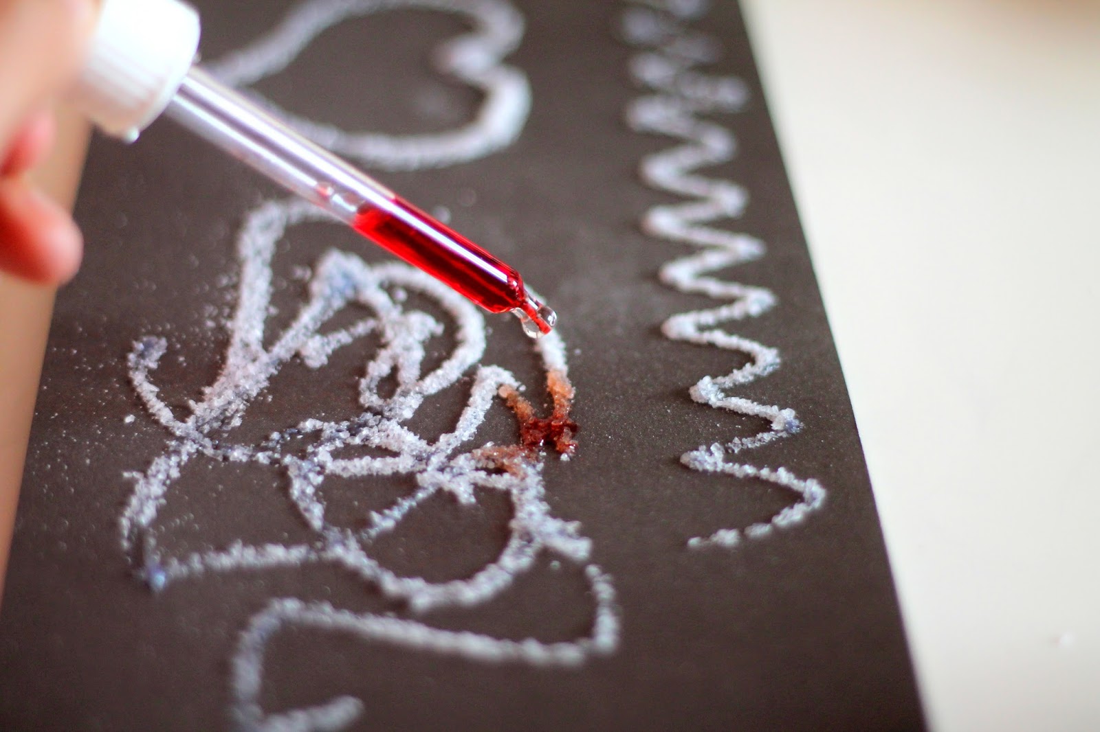 - jakmile je zasypáno, nabereme barevnou vodu do pipetek nebo stříkaček