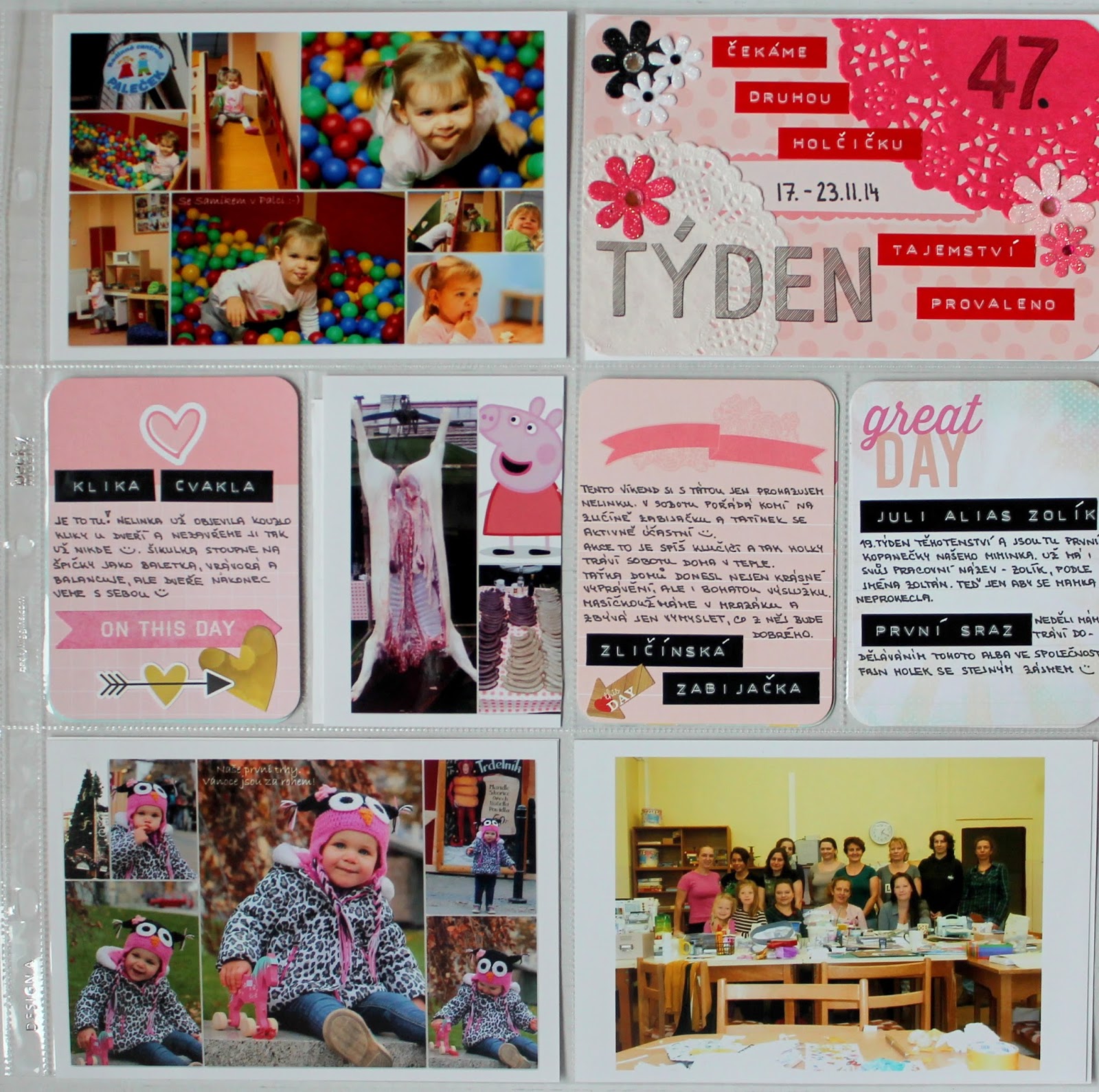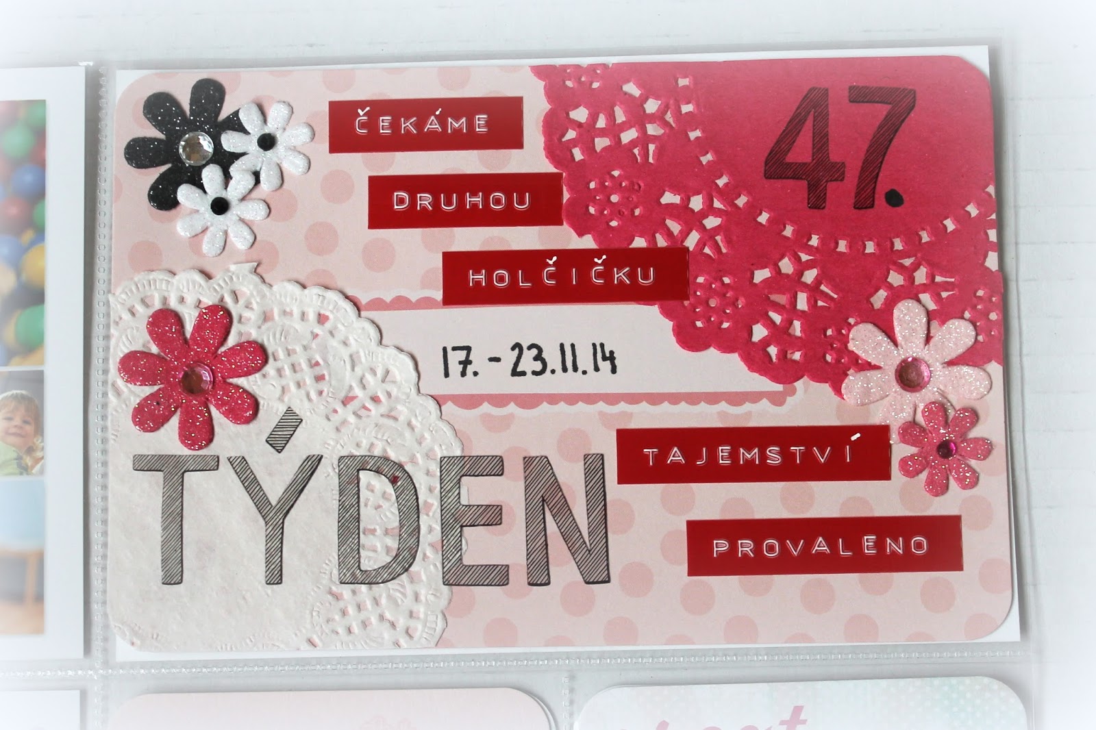 Úvodní kartička k týdnu je ozdobená kytičkami a jak já říkám „papírovým ubrouskem z cukrárny“. Pak už jen štítkovačem nějaký ten nápis a je hotovo.