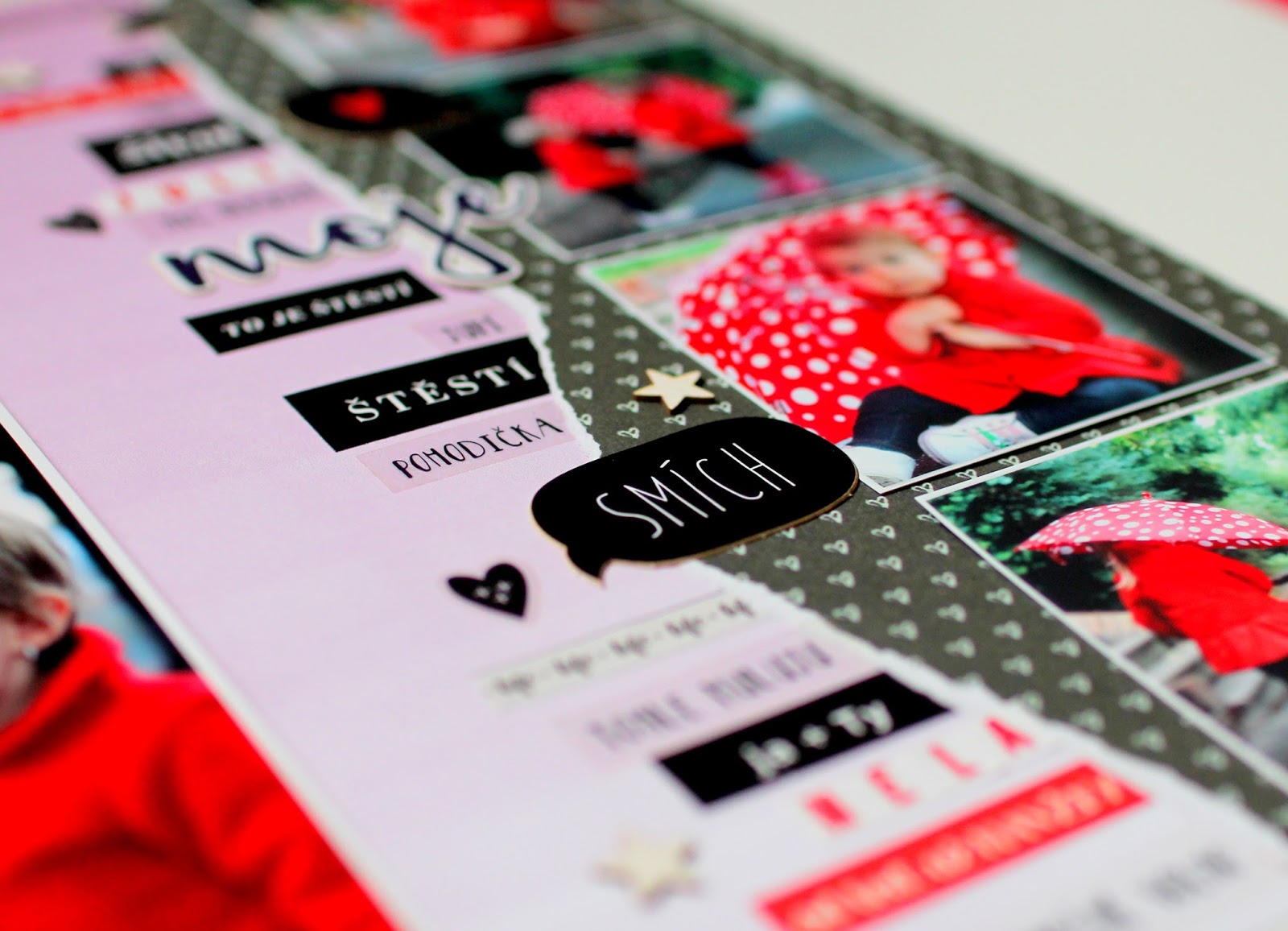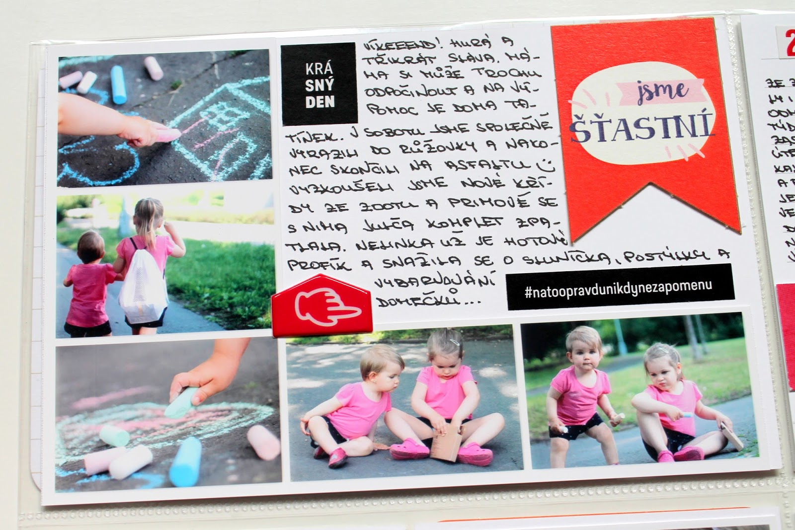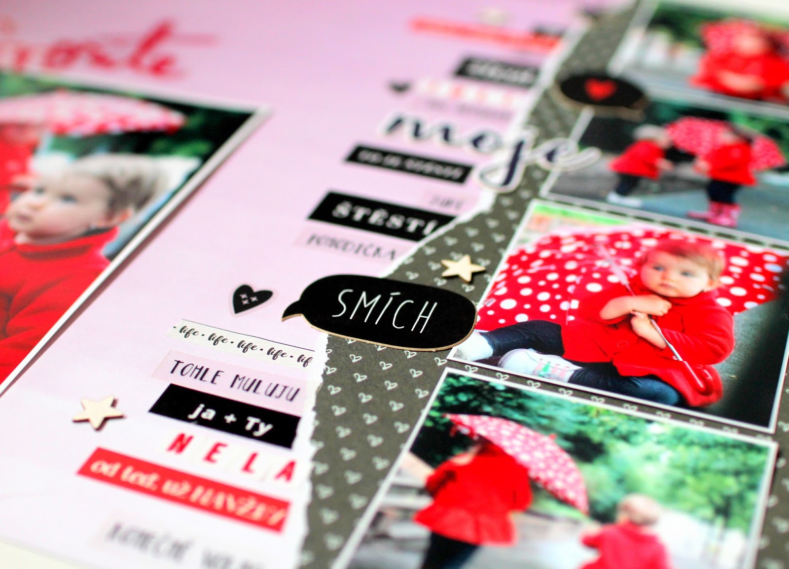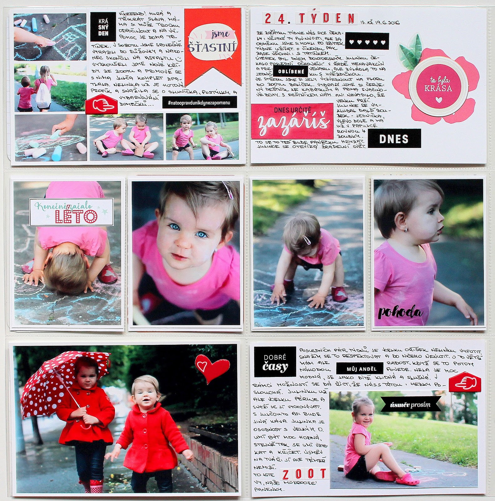 Že jde červená do kupy hlavně s černou, to se přeci ví. Já to tentokrát zkusila i se špetkou růžové, protože se tak vybarvily fotky z 24.týdne letošního roku. Abych růžovou přenesla i na velkou stránku, vybrala jsem jí jako podklad růžovku a výsledek se mi na červený mišmaš líbí.
