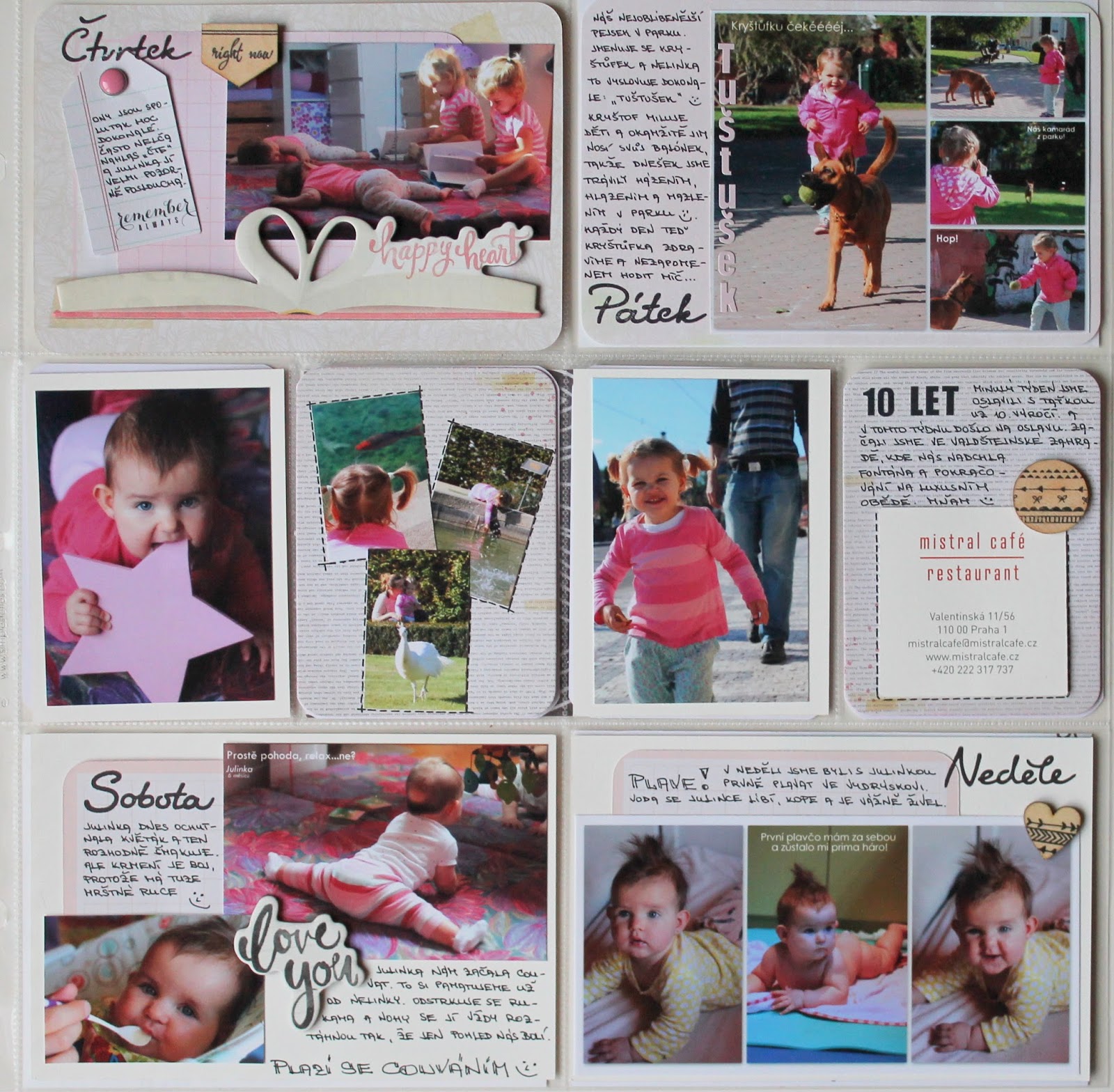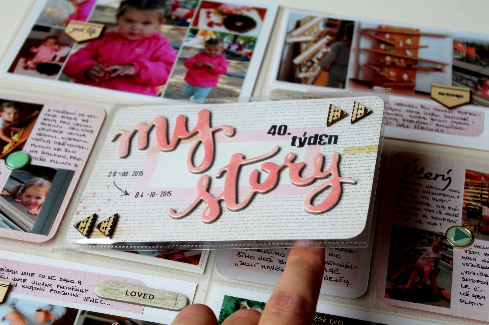Pod ní jsem schovala Nelinky nejlepší hlášky a věty, ve kterých v té době akorát začínala. Dnes už je to jasná věc. Neuvěřitelné, jak strašně rychle se děti učí a zlepšují se! (jen to uklízení ji příroda nějak nepřeje, tak je spíš regres zdá se mi 😀 ). Aby výsek vynikl, nic jiného jsem na kartičce nepodnikala. Datumovka označila týden a 4 dřevěné šipky doladily ostatní stránky.