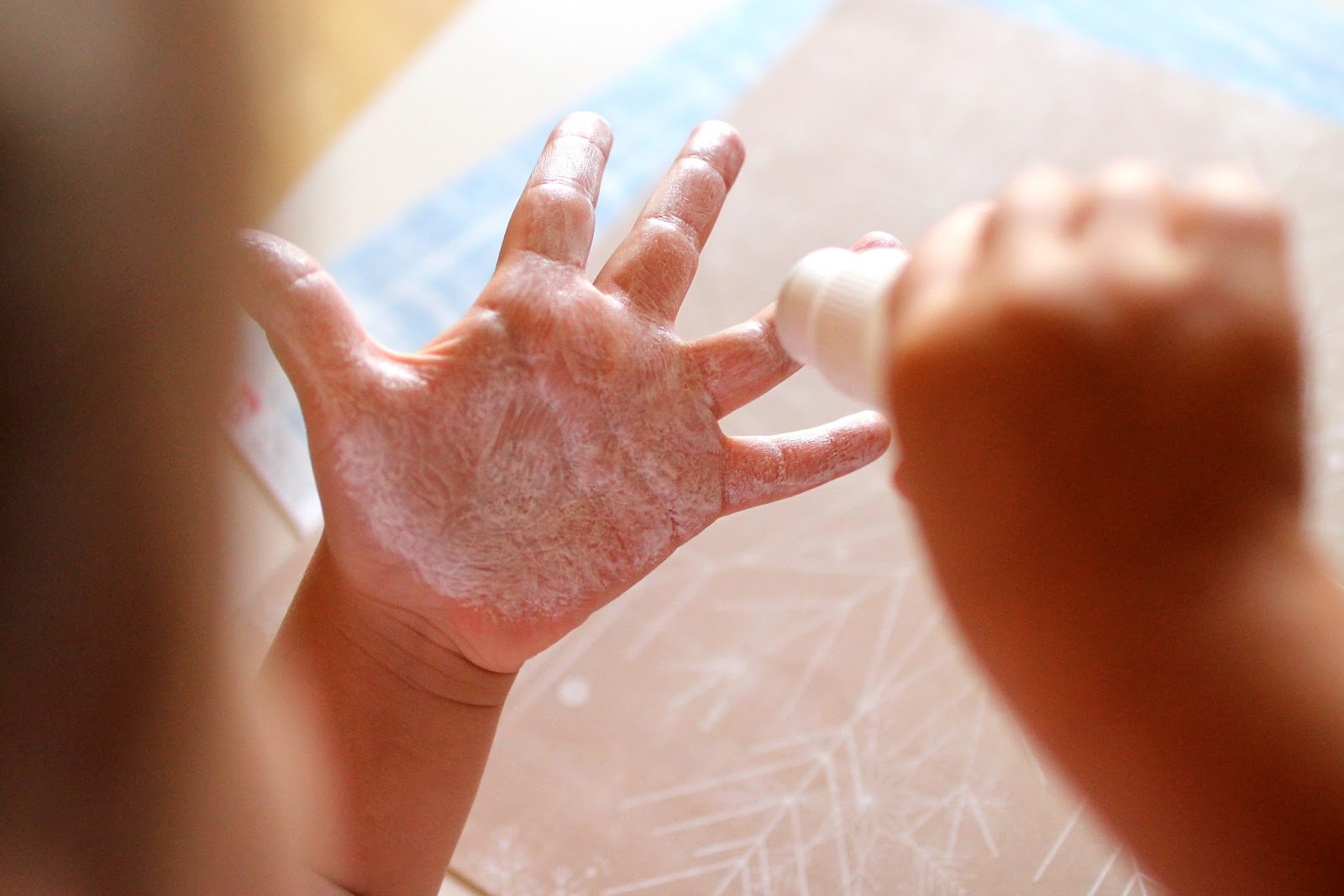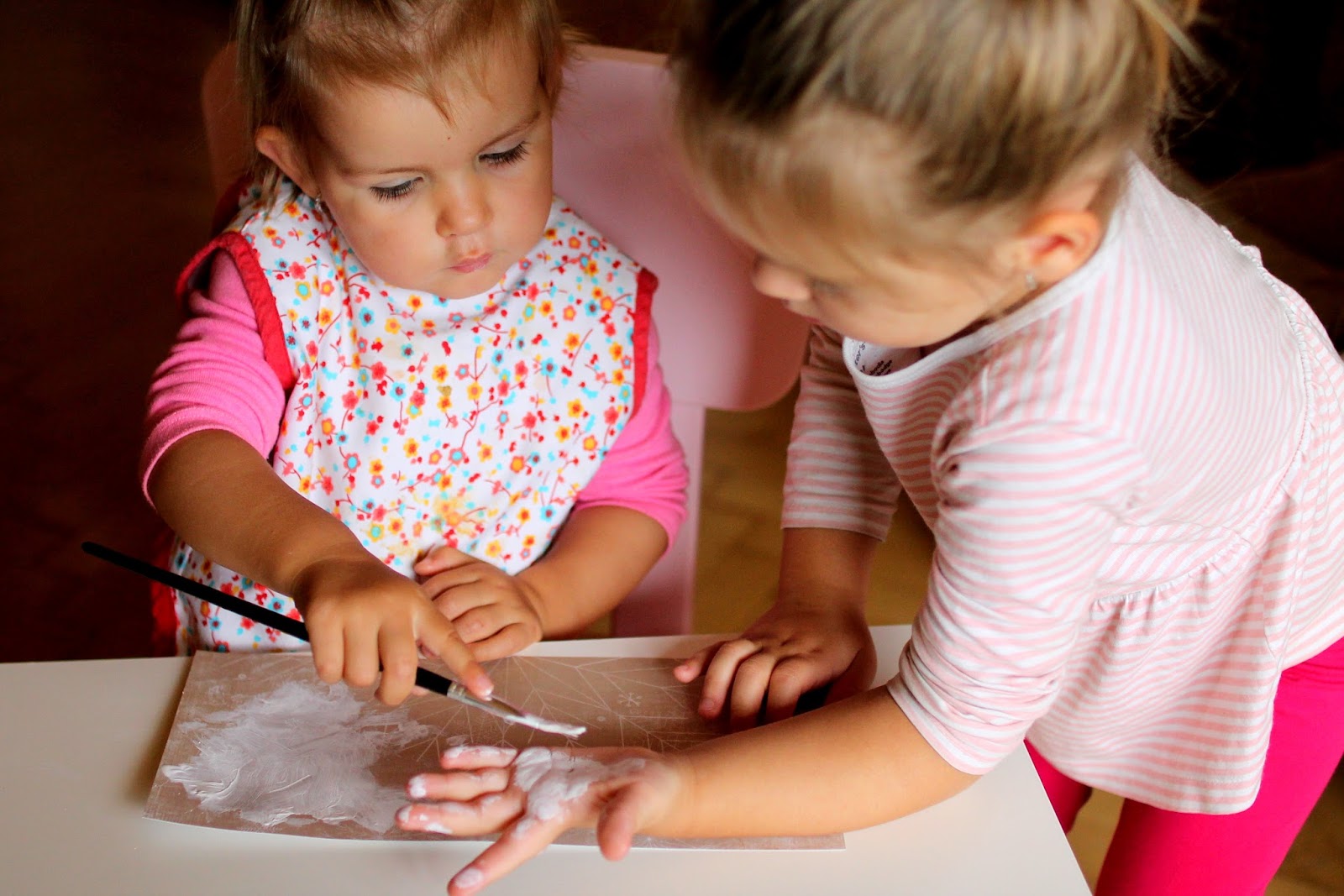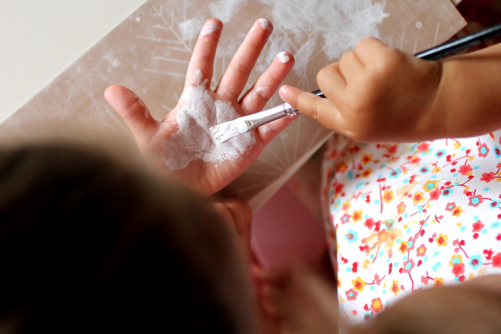 - děti si prvně celou ruku důkladně zaprasí bílou barvou..můžou k tomu použít barvy s aplikátorem, což je super hlavně pro ty malé (je to snadné) i pro nás mámy (nezačuní vše co jde)