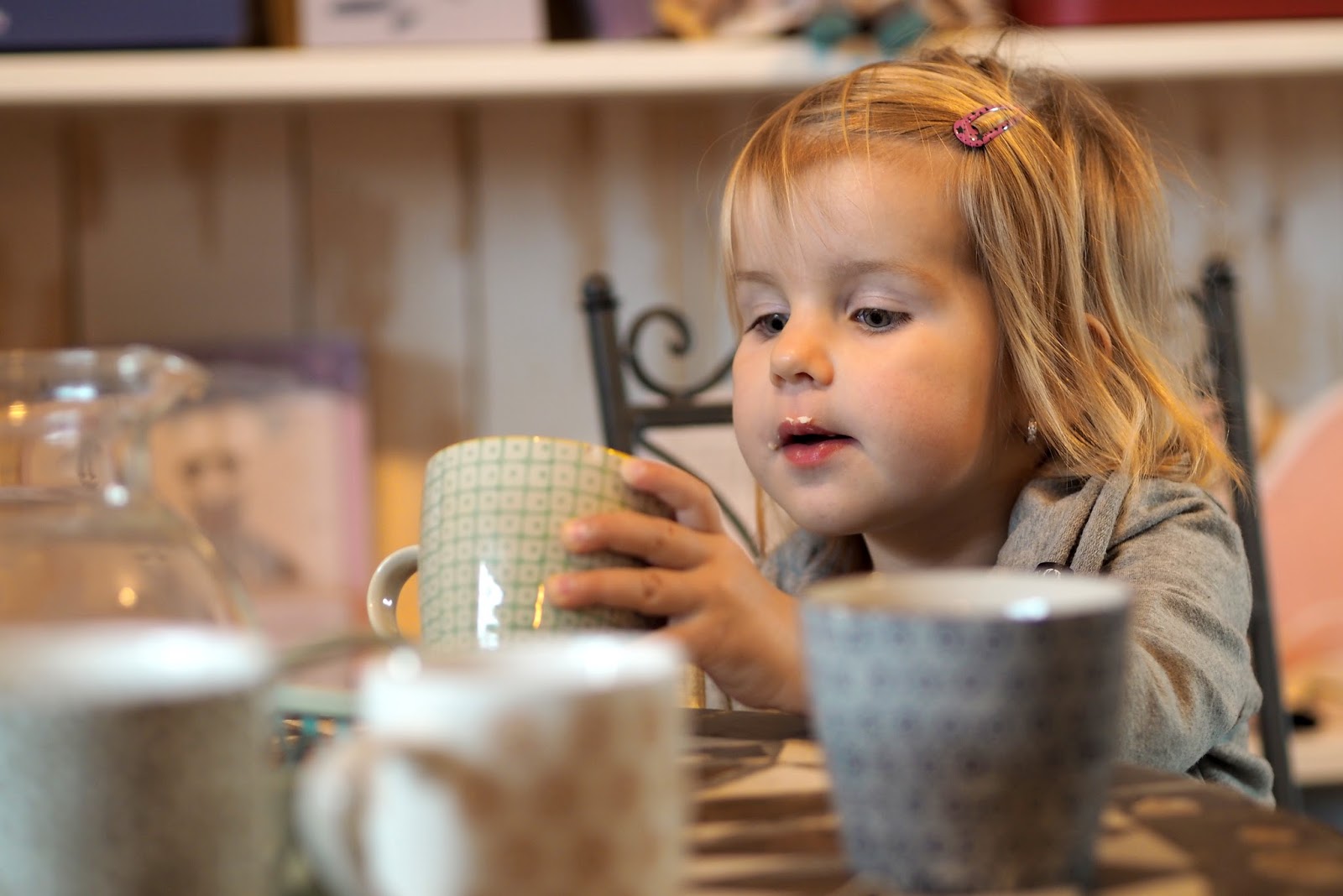 Každé pravidlo má ale svoji výjimku a tady je taky. Nelinka si prošla atelier, chvíli si pohrála kde se dalo a pak zasedla ke kuchyňce. Nevařila v hrncích, ale seděla na koberci u dřevěného občerstvení. Byla jsem nadšená a mám pocit, že jsem objevila Ameriku, ale zas mě spousta z vás setře, že to znáte :-D. Já neznala.Jde o dřevěné suroviny, které v sobě mají vždy dírku a vy si děláte sendviče a burgry. Nelinka si tam skládala tousty, stejnou metodou připravila Julince i obložený chlebík a ta se po chvíli k vaření přidala. Že vydrží taková hračka hodně bylo vidět na stavu všech surovin. V atelieru je to jako v dětském koutku, kuchyňka byla hodně hraná a pořád skvělá. To naše filcové jídlo v kuchyňce je jeden obrovský žmolek a ještě toho moc jiného holkám nedá. Tady seděla i Julča a prstíky se snažily dostat napichovátko do dírek a „navařit“ mamince dobrý toustík. Parádní a je to první tip na můj dárkový list pro Nelinku.