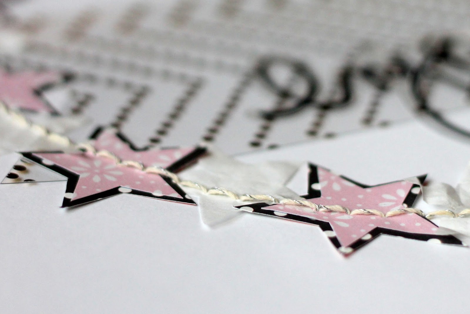 - Hotovo, hvězdy jsem přilepila a poslední krok…jde se šít. Tady jsem si na sebe upletla bič jak hrom. Vzala jsem si totiž provázek (stejný, kterým jsem omotala fotku), který je jednak silný a druhak proplétaný stříbrnou nití. Celý kruh měl navíc místa , kde se nešilo úplně dobře. Buď jsem čila skrz pauzák, na který se muselo opatrně, protože se trhá nebo jsem šila skrz tři vrstvy (bílý, růžová a černý papír)…místy vlastně vrstvy čtyři (plus acetátová folie) a to už jsem začala chvilkami nadávat 😀
