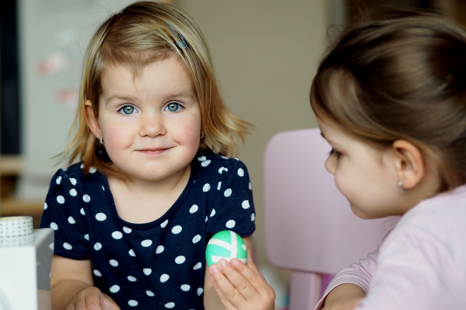 Jenže když už bylo vajec dost, přišla Nela s tím, že přeci já i Julie už vajíčka máme a ona ne :-D. Ne, nemohla si to nechat ujít, že? Takže jsme ještě ten den vytáhly zbylá bílá vajíčka, kousky voskovek a Nela vzala vajíčka ke kadeřnici. na čtyřleté dítě už fajn, ale ani tam to nebylo bez zádrhelu – to pro ty, co si myslí, že se nám furt jen daří :-D.