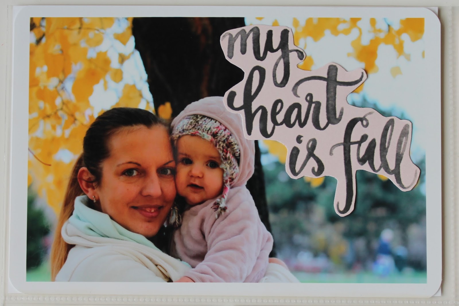 Nejprve jsem se bála, že se budou dva fonty vedle sebe tlouct, ale ve výsledku mi to ani trochu nevadí. Nápis „happy heart“ je vystřižený z kartičky Open Book Core Kit. Nadpis kartičky s Julinčiným úspěchem v 7 měsících je pak samolepicí abeceda Doodlebug Beetle Black TEENSY TINY ALPHA