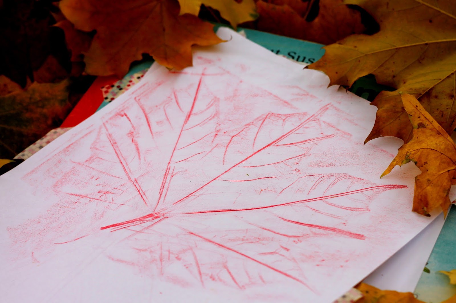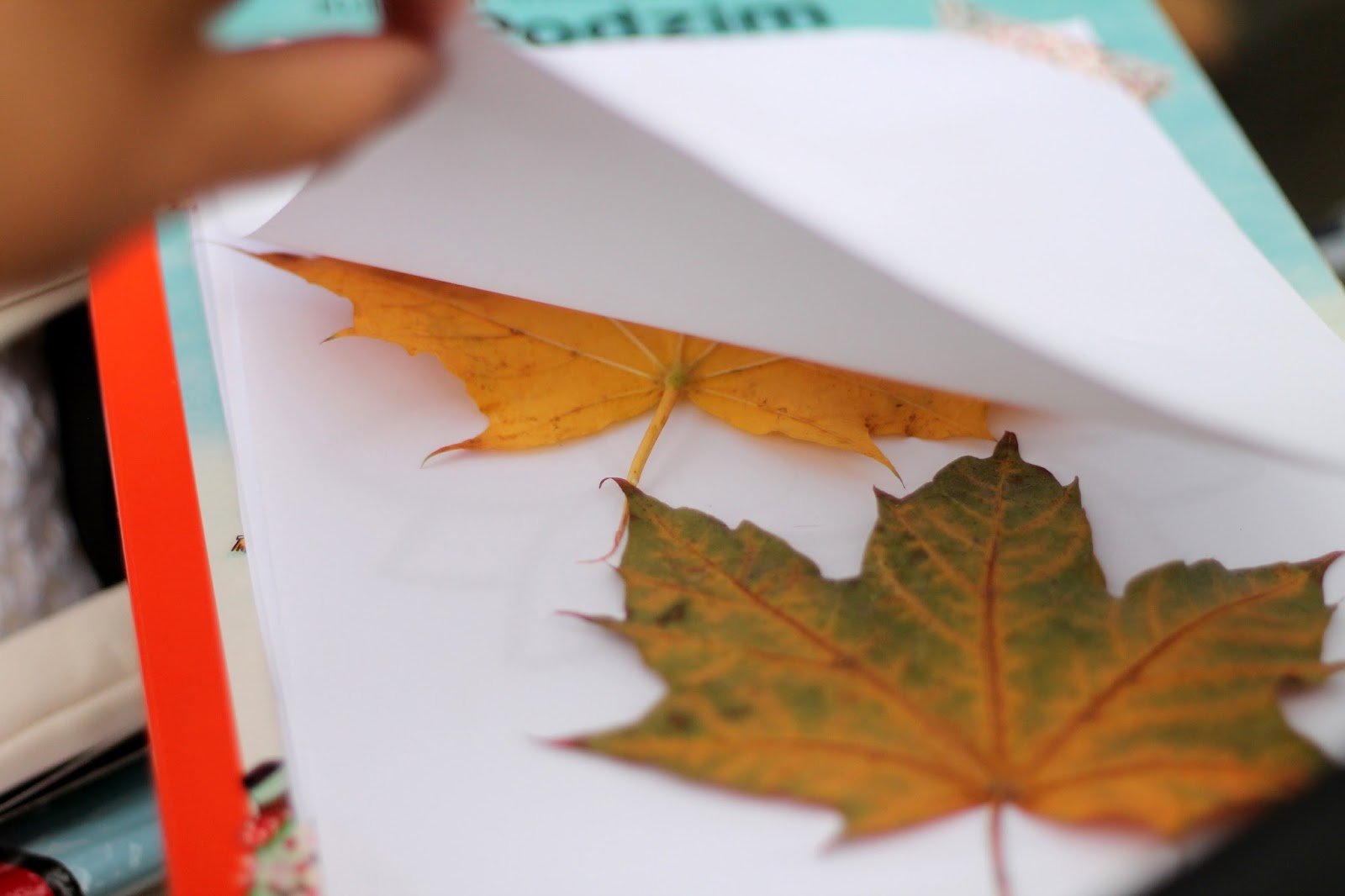 Pod papír jsem jim schovala dva hezké listy tak, aby je neviděly a Nelince dala do ruky voskovku. Zprvu měla problém s tím, že se s ní nemaluje klasicky, ale voskovka leží a maluje se celou její plochou, ale když viděla, že se jí něco objevuje na papíře, problém byl ta tam.