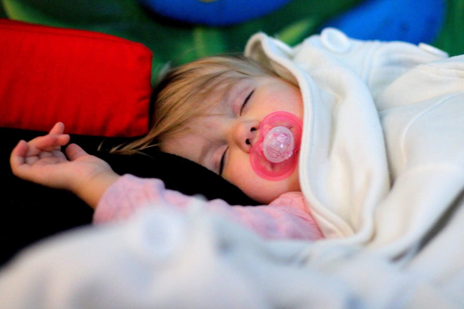 Velká neznámá ale bylo spaní Julinky. Venku pršelo, takže jít ven s kočárem se nám nechtělo a uvnitř je všude koberec, takže kočárky se nechávají na začátku v šatně. Zkusila jsem akci pokus omyl, protože Juli je boží spáč a našla si v herně klidnější místečko, kde jsou žíněnkové kostky. Z nich jsem postavila Julince malou temnou komoru a bylo :-D. Juli se sklátila na hromadu a do třech minut byla tuhoš. Doma by mi sice spala hodiny dvě, tady nám ta jedna bohatě stačila.