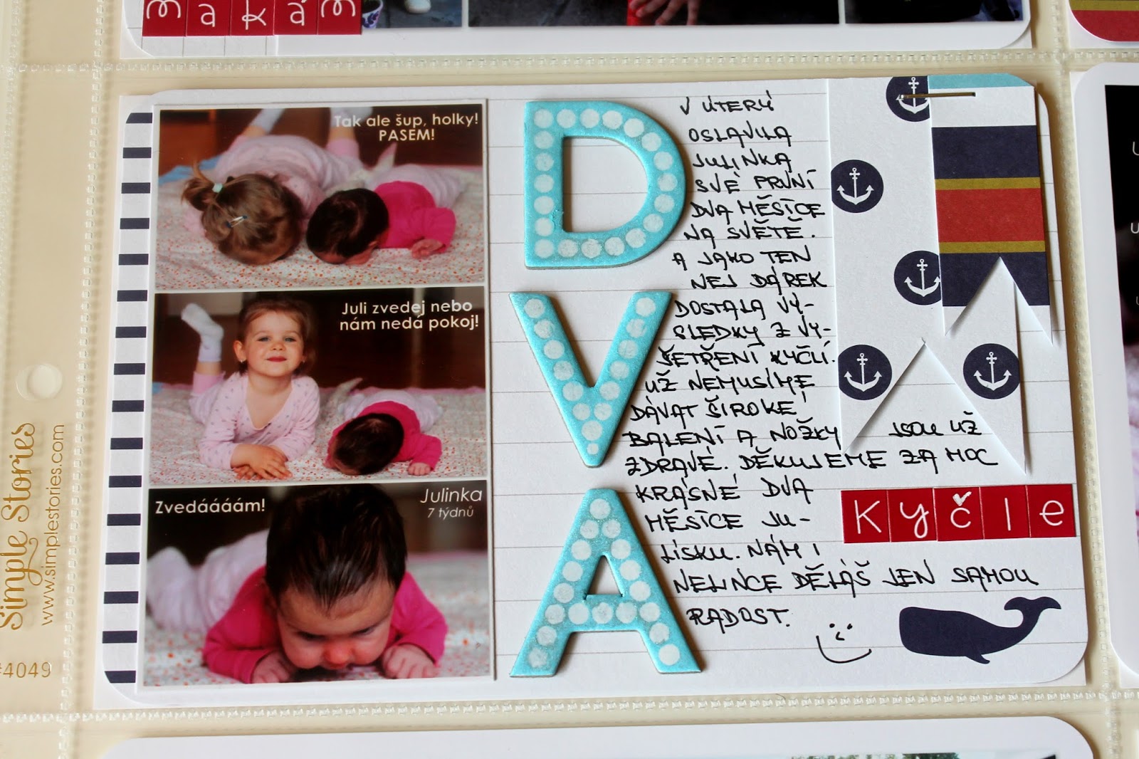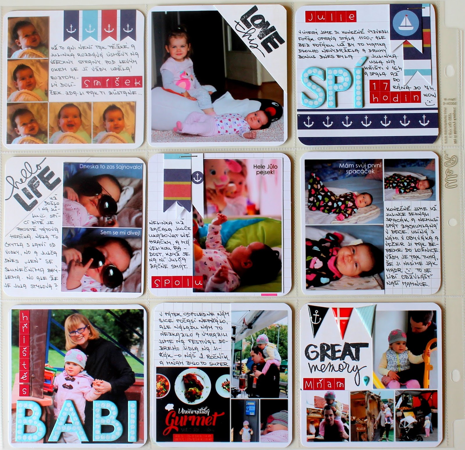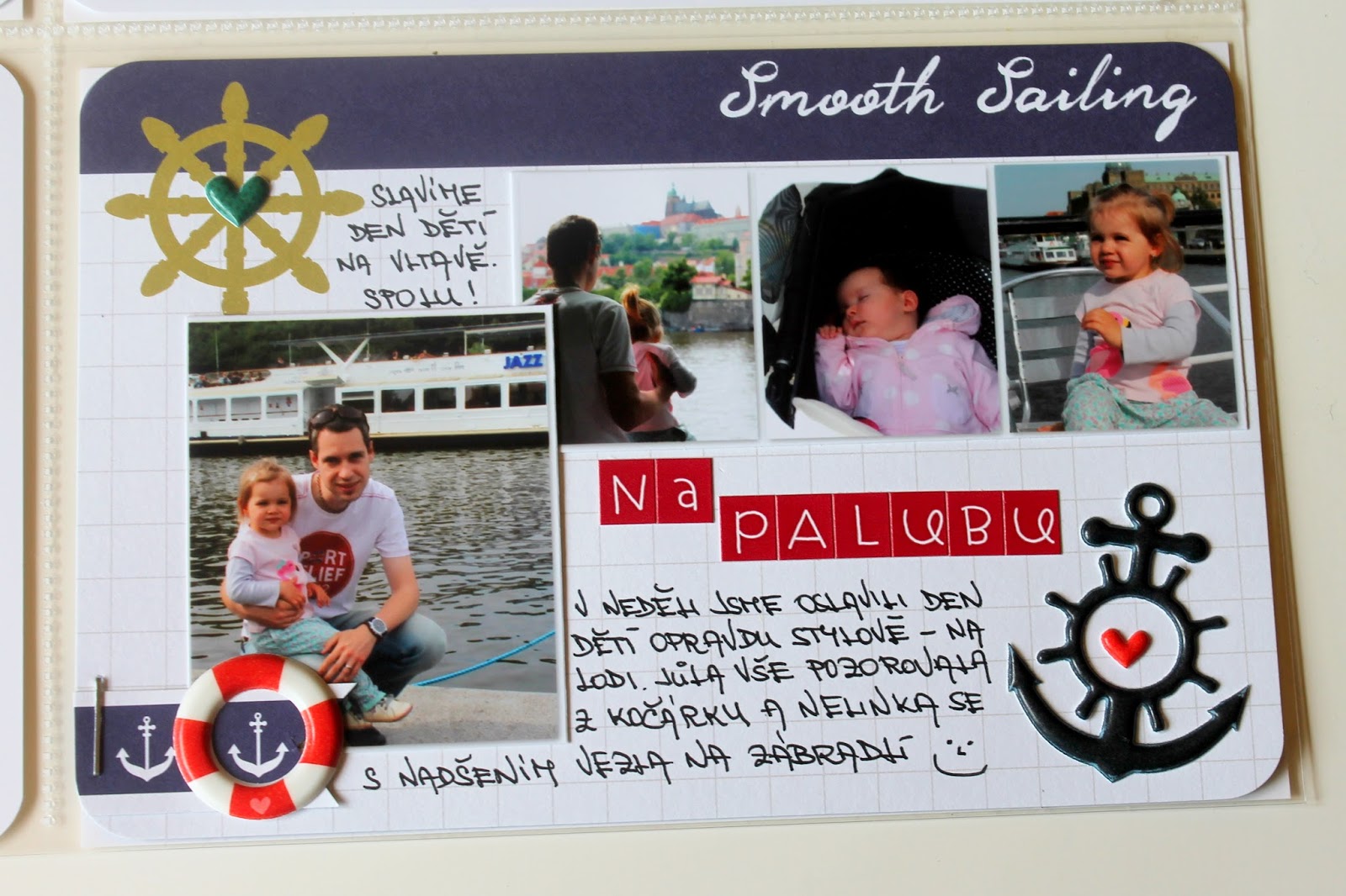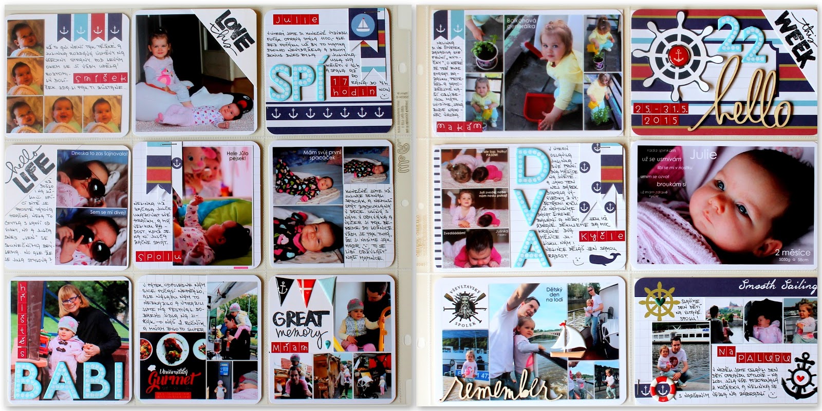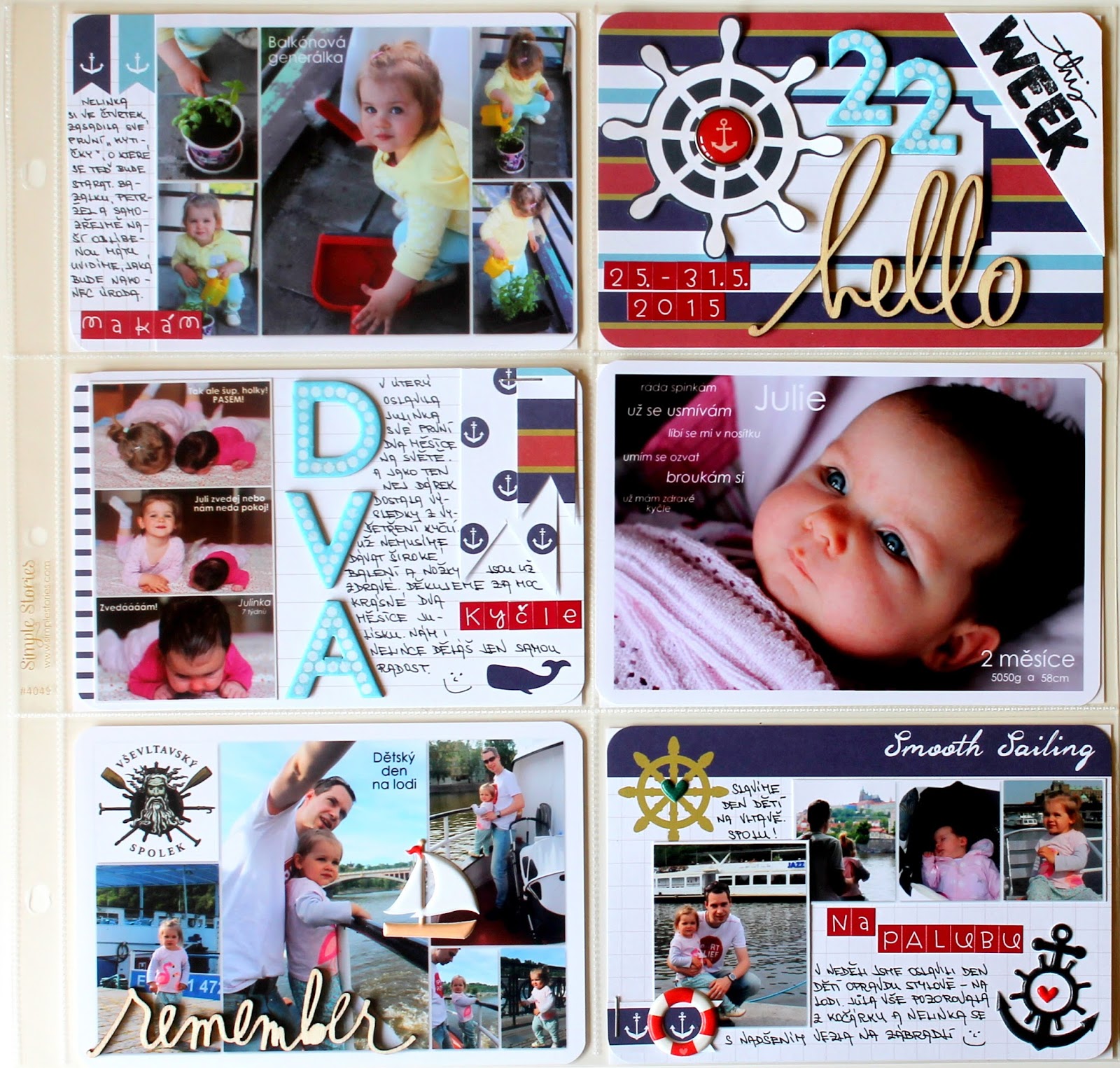 Mělo by těch střed být víc! Ano, protože by mě to nutilo mnohem více lepit a byla bych aktuálnější. Ale protože jsem tu s vámi jen 4x do měsíce, je tu pro Vás dnes náš 22.týden. Byl krásný! Miluji letní počasí, a protože bylo nejen krásně, ale zároveň se slavil Den dětí, vzali jsme holky poprvé na parník… a to si žádá mou milovanou sadu kartiček Nautical Themed Cards. Všem co si na námořnické ulítáváte ji vážně doporučuji!
