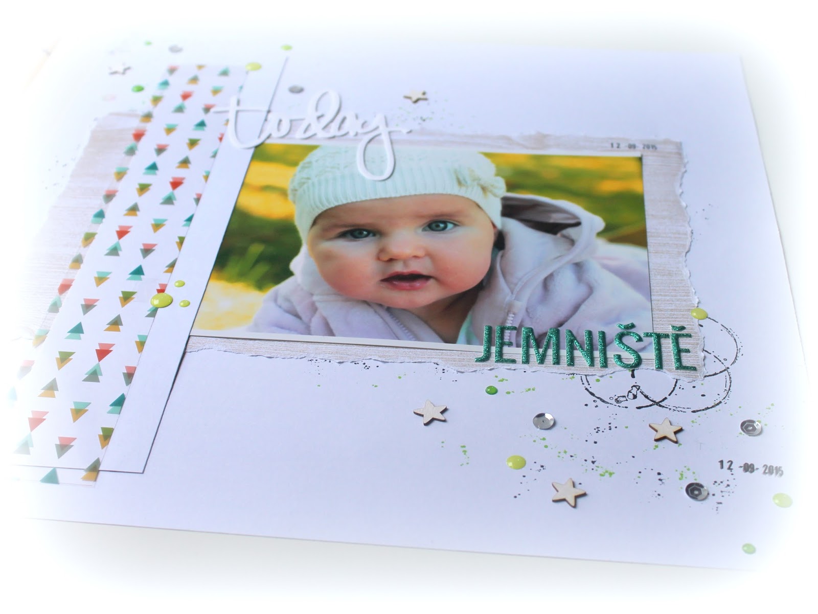 To bych nebyla já, kdyby tam nebyla nějaká ta enamelka a nezapomnělo se ani na flitřík a trochu toho dřeva :-). Na závěr nalepit třešničku na dortík: „Today“ papírový výsek od milé Heidi Swapp