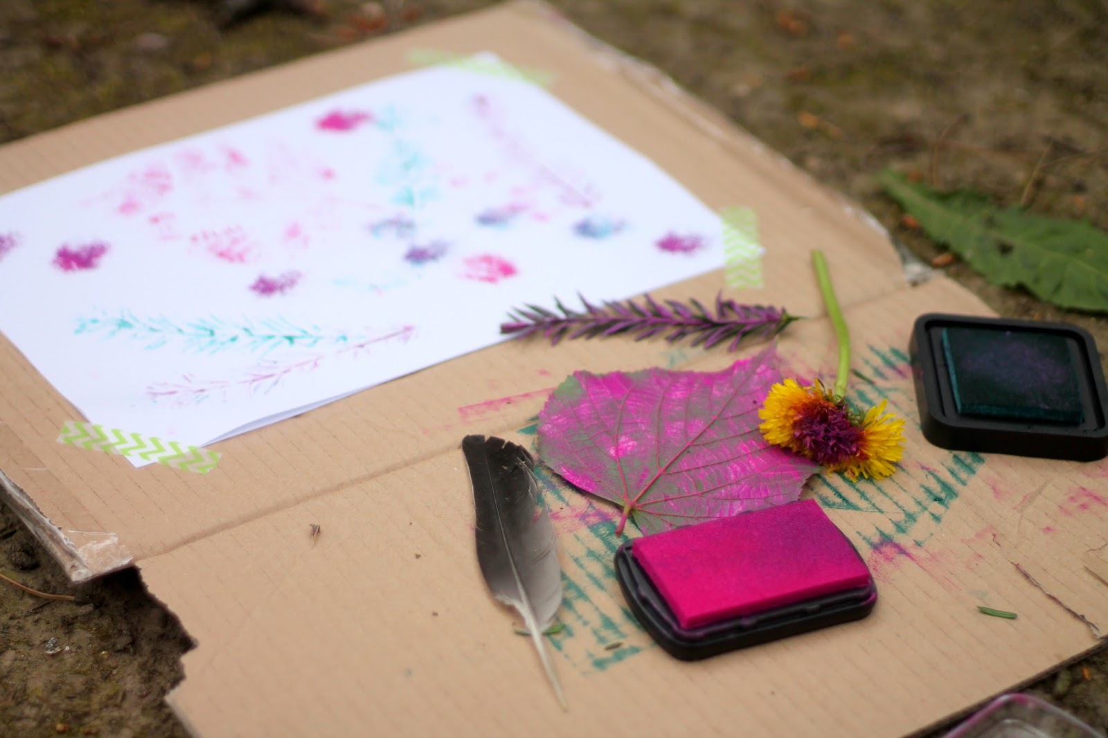 - tady naše nejlepší poklady, kartonová deska a značně jeté razítkovací polštářky 😀
