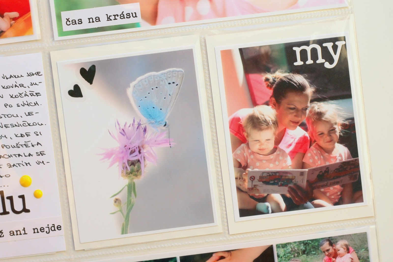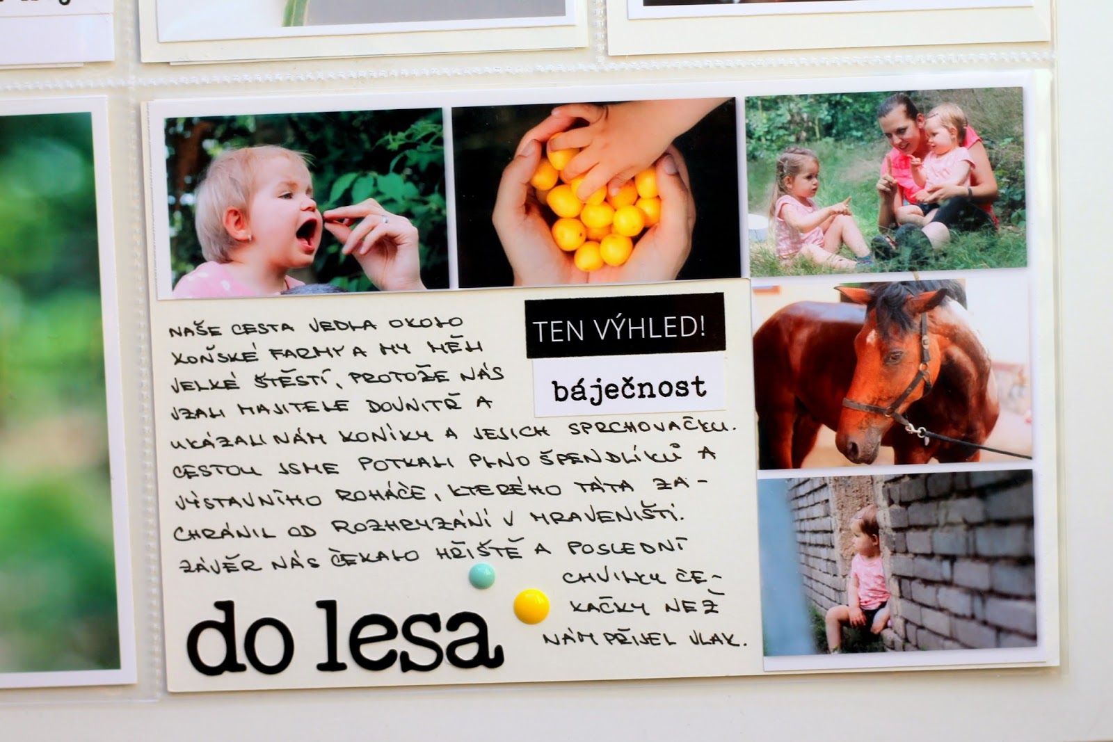 Máte ty velké stránky rádi? Mně se asi netřeba ptát. Já mám v albu každý týden jednu takovou velikou stranu a hlavně mě děsně baví je lepit. Miluju, když díky tomu prostoru vynikne fotka, kterou si vyberu a někdy to není ani trochu lehké vybrat, která z těch všech je pravě tou, která se bude vyhřívat na výsluní. U téhle strany vybral náš táta a já myslím, že vybral moc dobře :-).