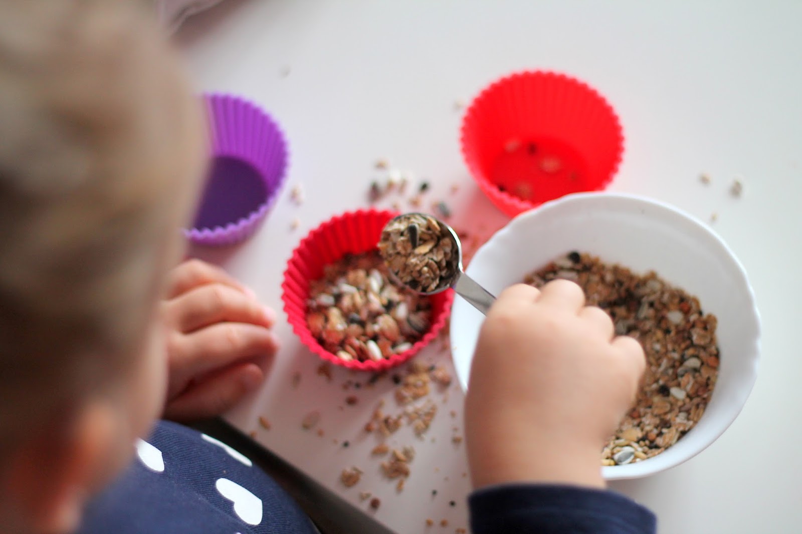 - naplníme formičky směsí pro ptáky – Nelča si na to vzala lžíci, protože špinavé ruce zatím nejsou nic pro ni :-D. Nechápu, jak může být takový pískomil, z hřiště chodit nejšpinavější ze všech, ale při malování jen štětec, při kreslení jen pastelku a dnes jen lžičku :-). Nelča bude estét…