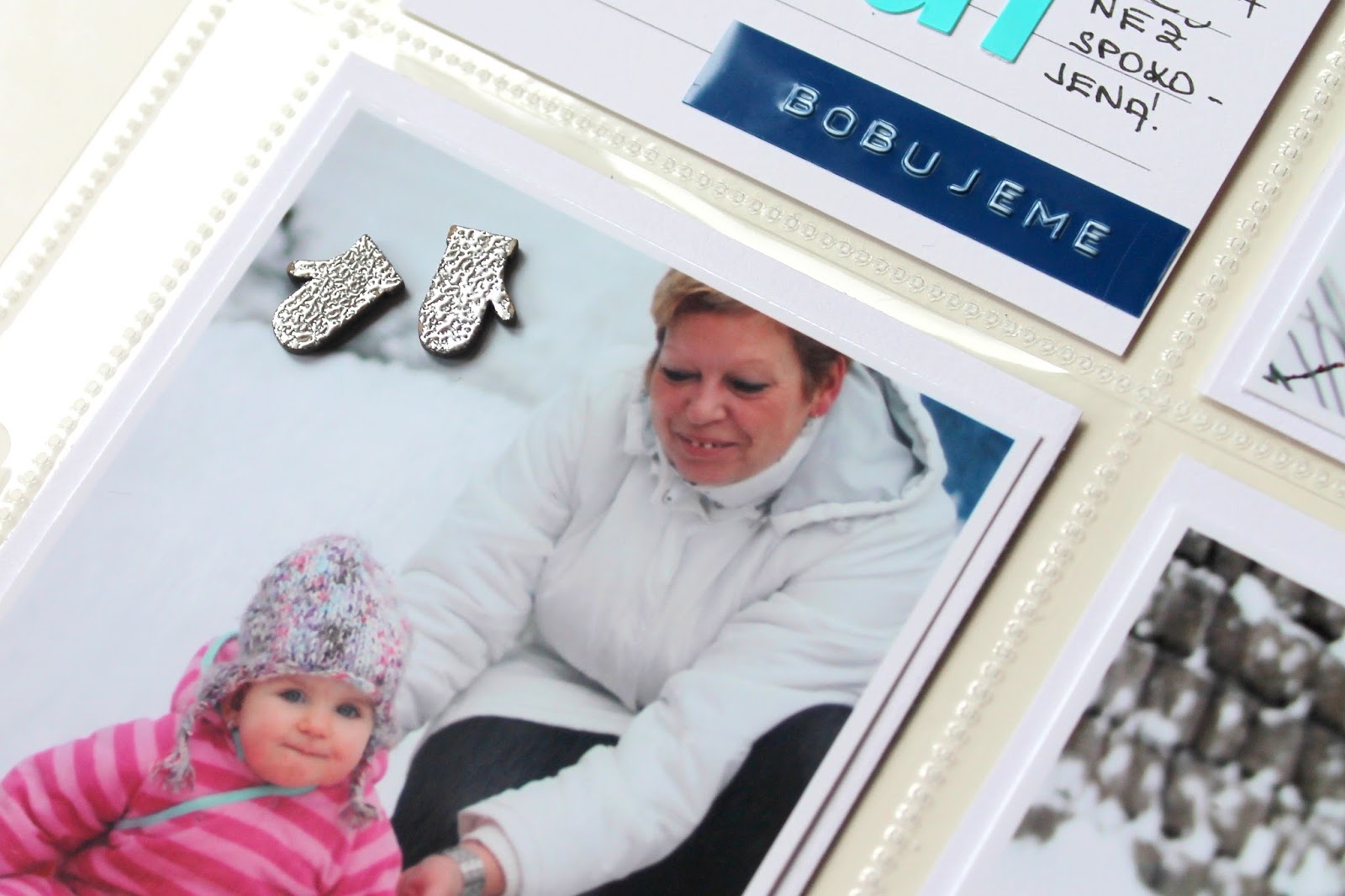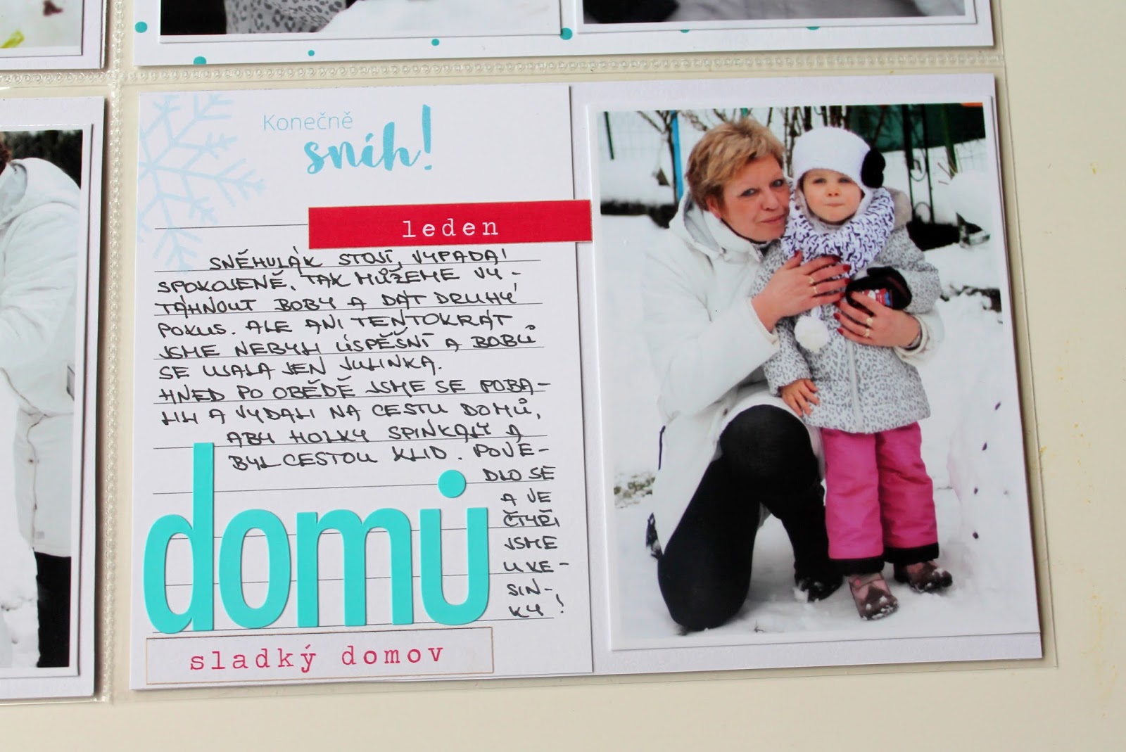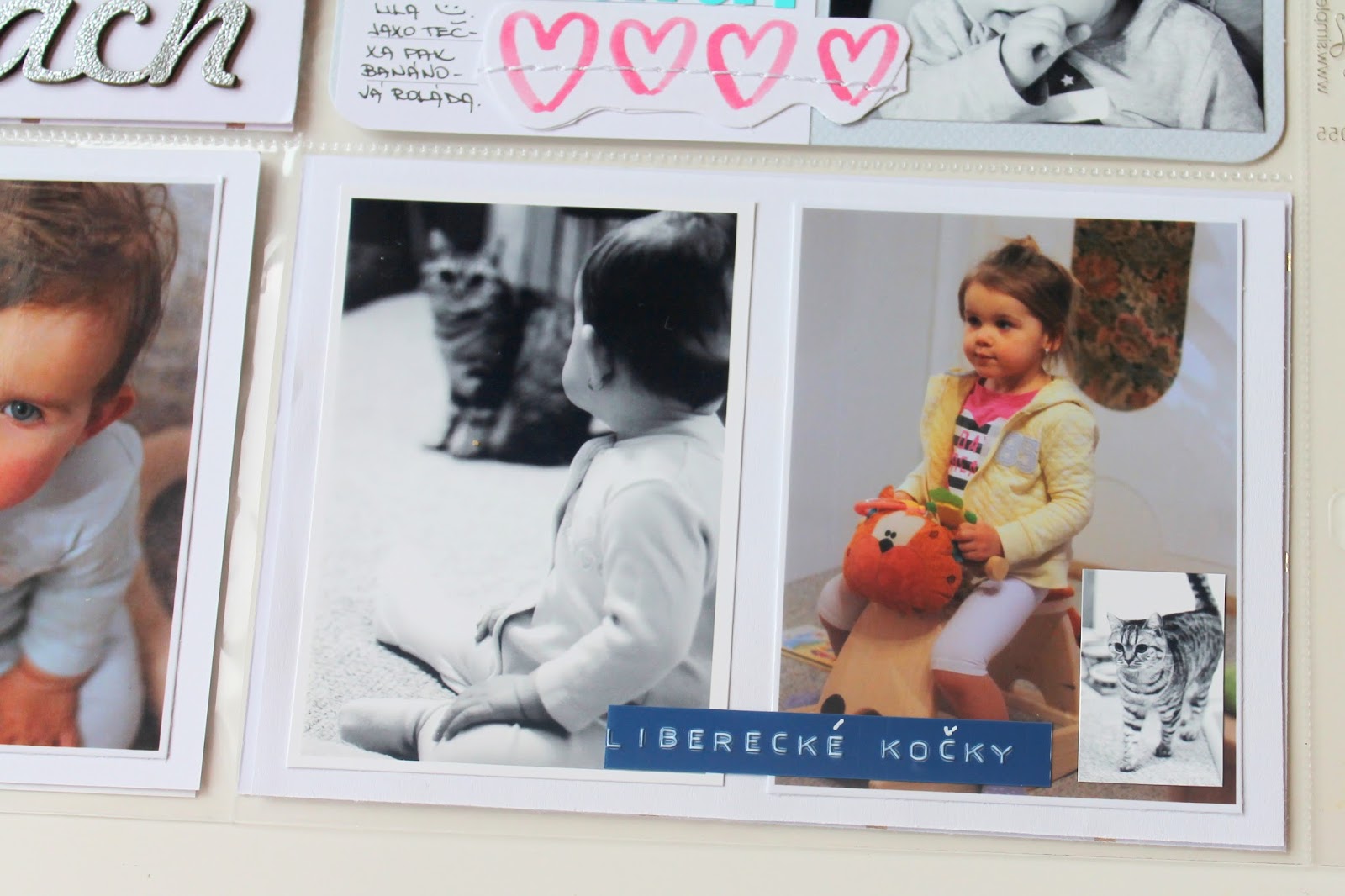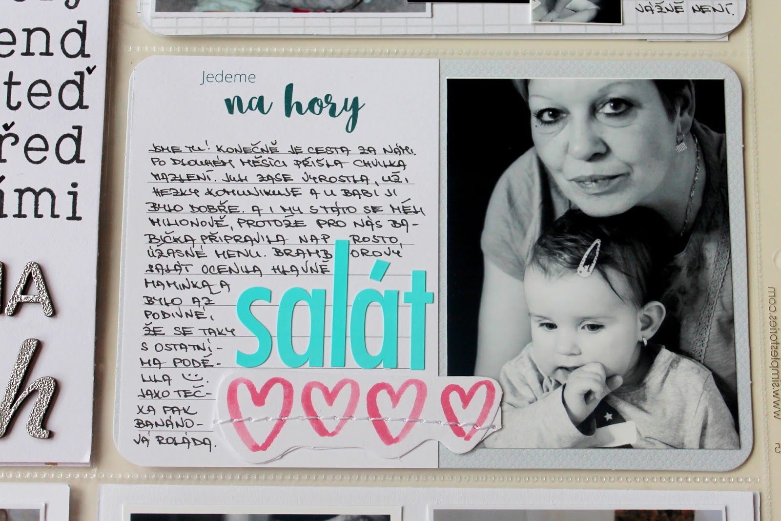 Opět krásné stránky – super sladěné. Kartičky jsou úžasné, barva písma taky a hlavně se mi líbí kombinace těch černobílých a barevných fotek. A musím pochválit babičku, že má super bílou bundu – ta se hodí na každou fotku. Dnes jsem zrovna u focení kárala manžela, že mě má s holkama vyfotit tak, ať jde vidět jen zelené kolem nás a né šíleně barevný barák za náma, tak se divil co si vymýšlím 😀 Tak jsem mu na to řekla, že může být rád, že jsem ho nenutím se oblíkat tak, abychom všichni ladili 😀 😀 (Verča S.)