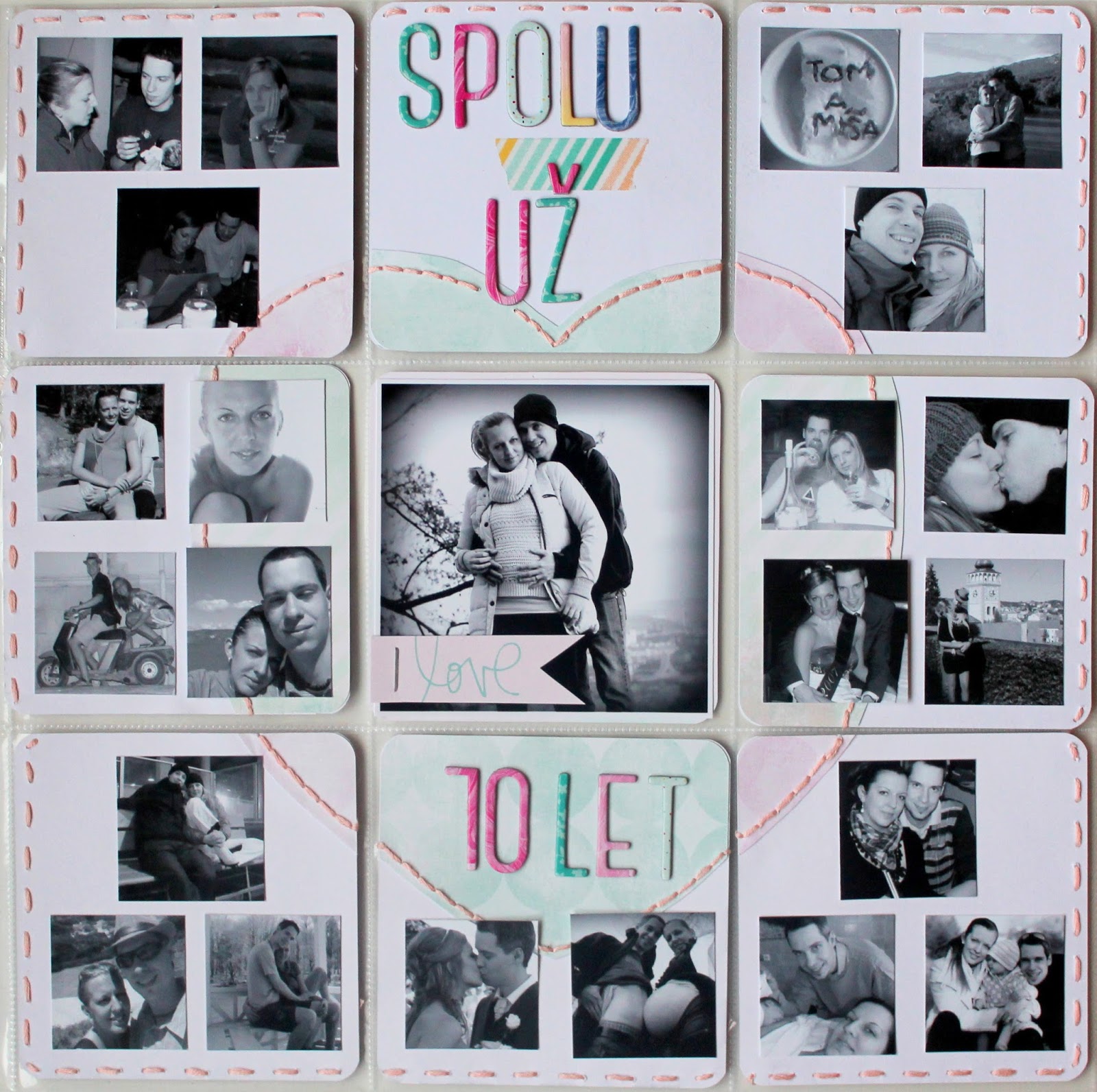 Vytvořila jsem stránku z čtvercových kartiček, na které jsem se snažila nevyužít klasickou červenou a růžovou, ale sáhla jsem do kartiček Dreamy core kit. Celou stránku jsem dělala jakoby to byla velká třicítka. Nejprve jsem si na stránku udělala z kartiček srdce, které jsem rozstřihala z kartiček z kitu. Ty jsou krásně jemné, decentní barvičky.